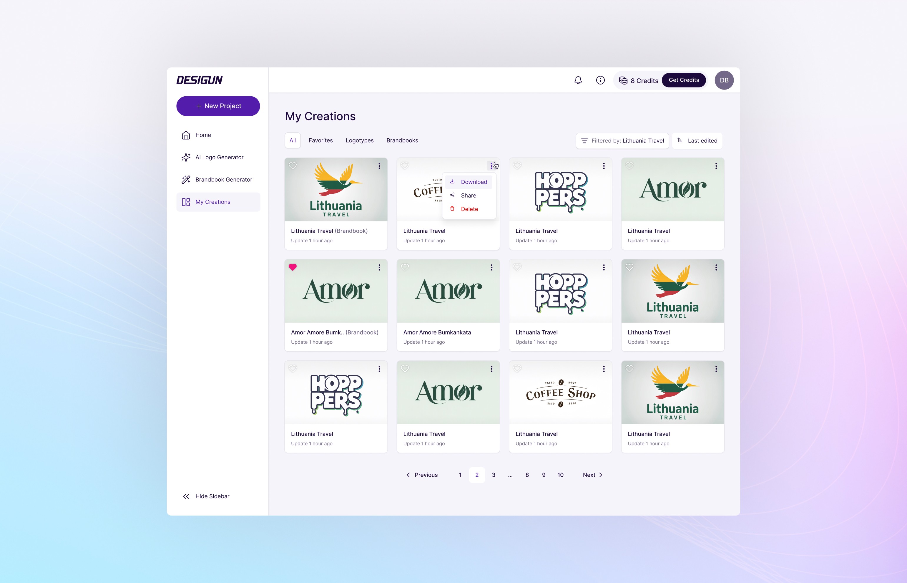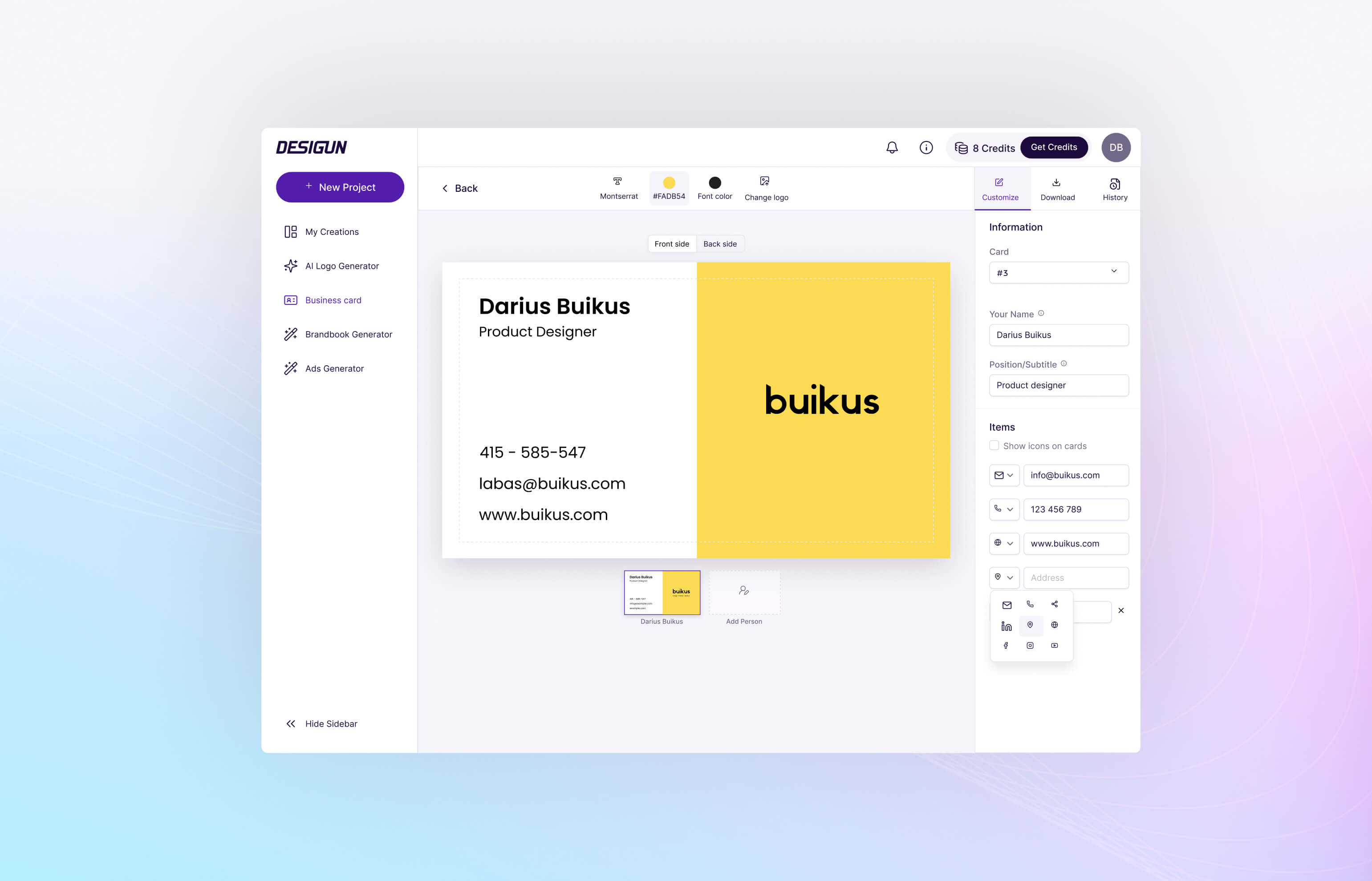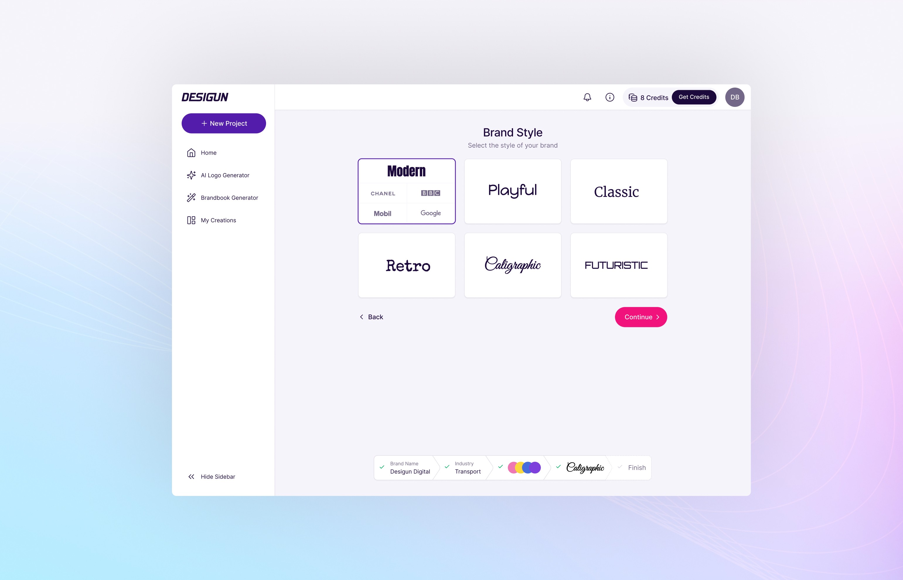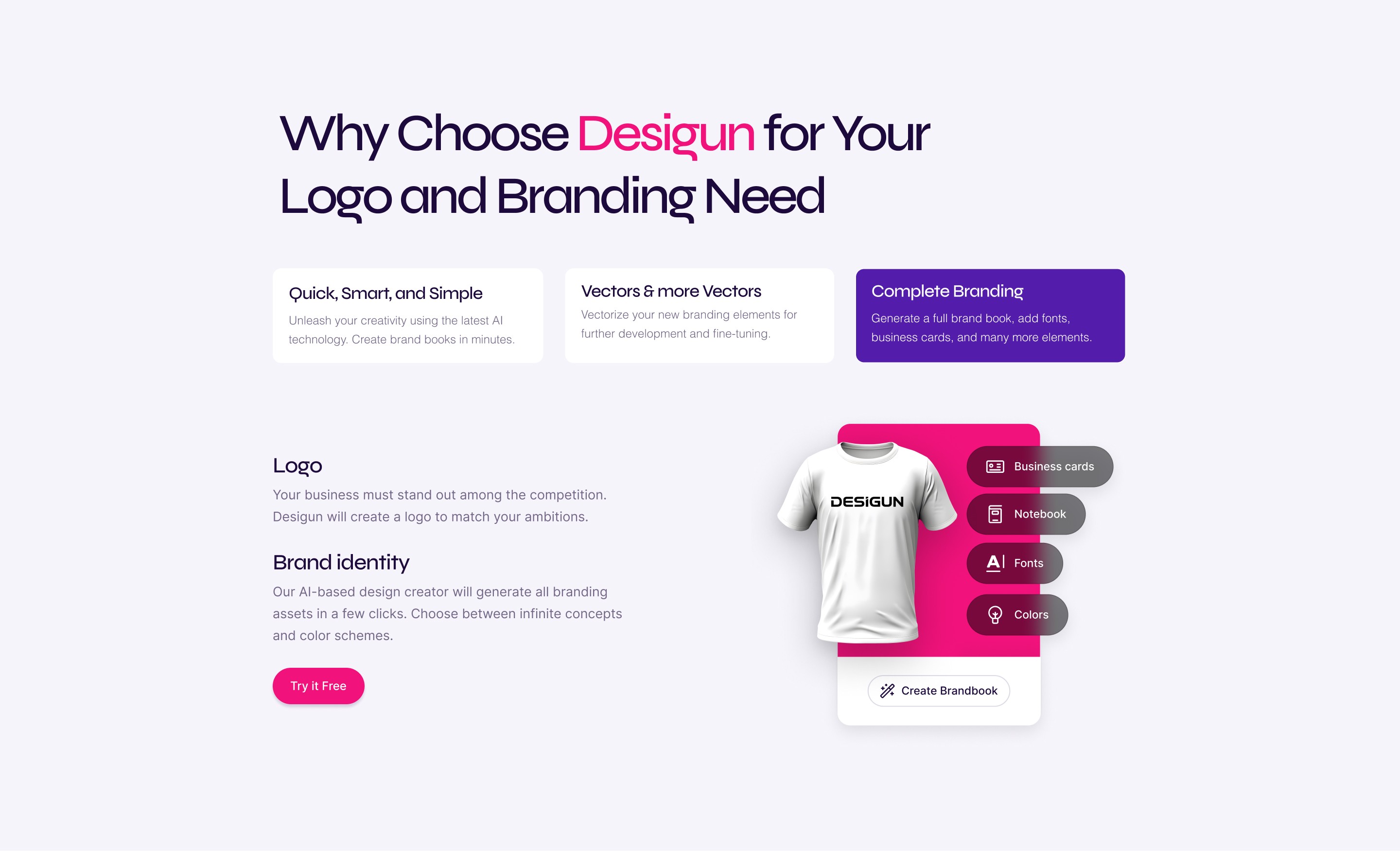 Desigun is your AI-powered designer. Create your new logo and a full brand book in less than 5 minutes. Application of Desigun has no limits on industries, whether you are opening an online store, creating a crypto project, or a bakery. Create your own unique design!